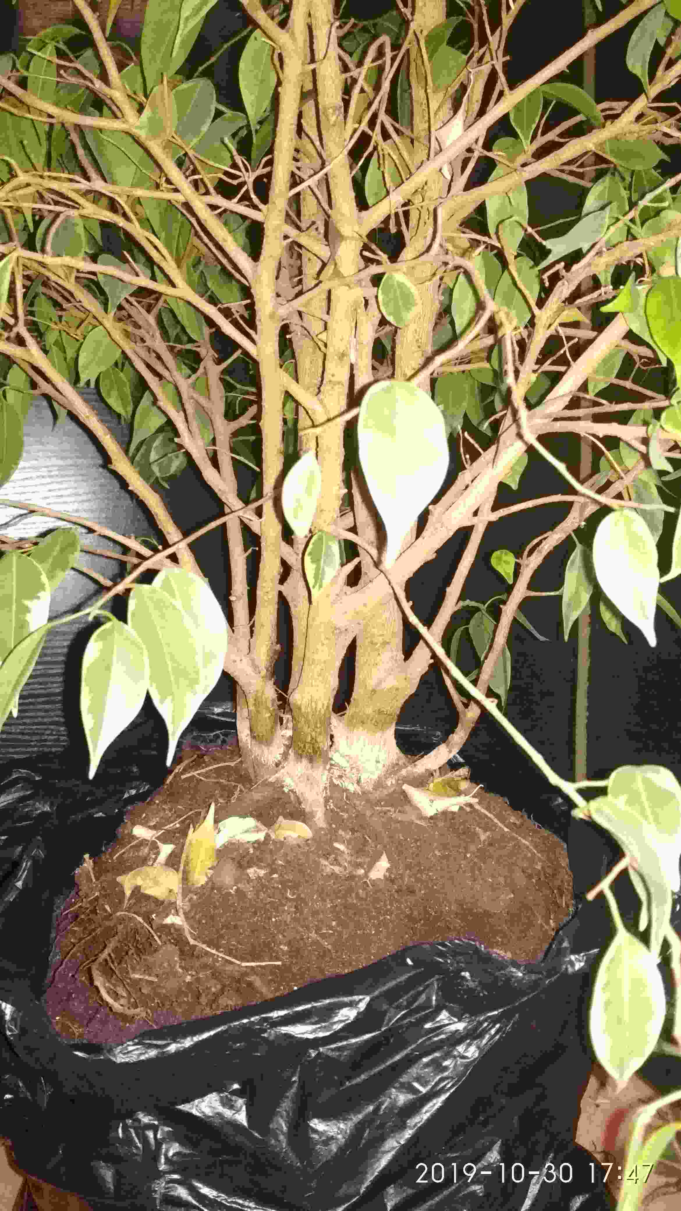 Вот вроде бы со всех сторон сфоткал, выношу на всеобщий суд. Фикус отдали без горшка, в связи с чем вопрос- уже приобретено ведерко с запасом под него. Перевалить, подсыпав земли или же оголить корни, чтобы понять- все 4 ствола это разные деревца или одно целое?