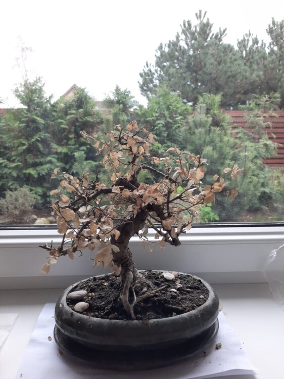 Burwell Опубликовано 14 Ноября 2022 Поделиться Опубликовано 14 Ноября 2022 Здравствуйте! С моим любимцем (вяз) беда, всему виной несколько переездов. В декабре прошлого года начались его страдания, переезжали в другой регион, таскали его с собой, по улице и пр. После этого стал понемногу желтеть и сбрасывать листья. Но не существенно, новые ветки пускал, на зиму на покой не отправляли. Весной заменила грунт, (очистила корни, не подрезала особо) был еще магазинный, решила купить специальный грунт для бонсай на озоне. Летом жили в частном доме и бонсай решили выставить на улицу на лето с предположением, что морской воздух и хорошая влажность ему будут на пользу. Не сказать, что ему понравилось, продолжал желтеть и скидывать, понемногу росли новые ветки. Удобрять особо не удобряла, т.к болел. Осенью опять переезжали и решила на какое-то время оставить на передержке у знакомой, подумала, что хуже моего ухода быть не может. Она поливала по моей инструкции по мере подсыхания почвы, стоял на подоконнике, солнца уже не много, но само собой отопление батареями (его почему-то виню). Когда я собралась забирать бонсай, она прислала мне фотографию (я конечно в шоке, что она подумала, что это норм и ничего не сказала, но вина тут моя, оставила своего питомца), а там такое((( Ничего подобного не было, стоит в желтых листьях целиком, абсолютно сухой. Скажите пожалуйста, умерло дерево или еще есть шанс спасти? Если есть, то что посоветуете? Я подумываю обрезать ветки мелкие сухие и поставить в холодильник на зимовку. Ссылка на сообщение Поделиться на других сайтах