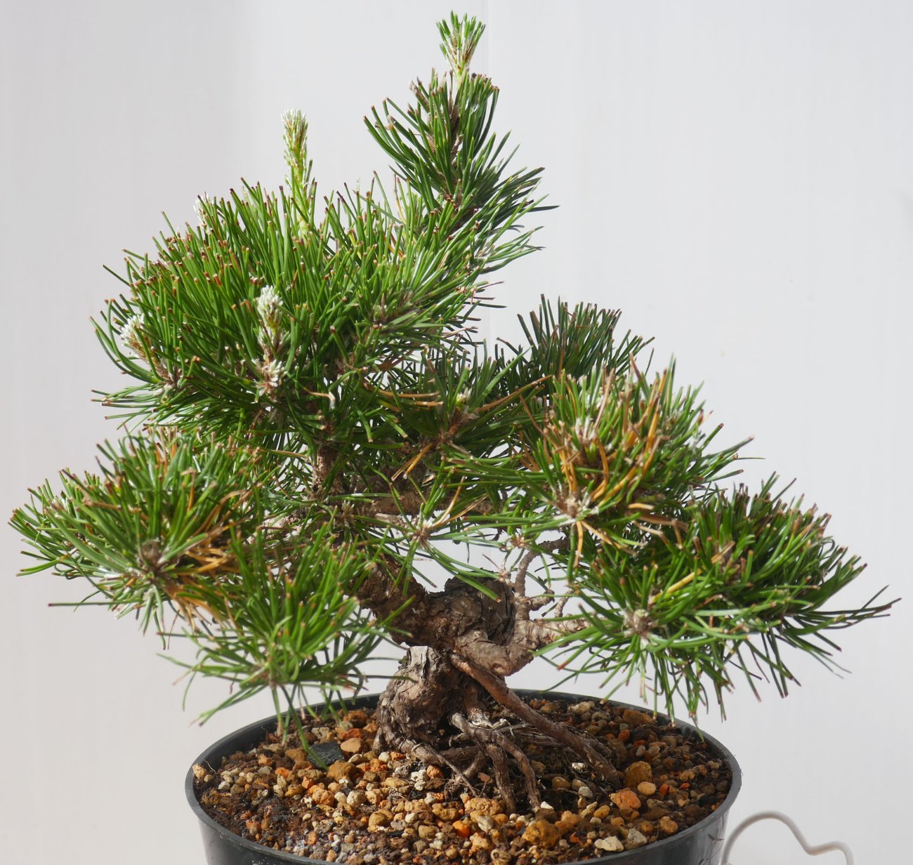 Сергей Кондратенко Опубликовано 24 Января 2024 Поделиться Опубликовано 24 Января 2024 Пока есть время, выложу-ка я еще одно интересное дерево - сосну тунберга, или японскую черную. По-английски ее часто сокращают, как JBP - japanese black pine. История начинается в феврале 2015 года, когда удалось первый раз съездить в Японию. На память оттуда привез несколько растений, одно из которых успешно дожило до нынешних времен). Вот так сосенка выглядела непосредственно после приезда: На фото скрадывается масштаб, но она всего 12 см высотой и сантиметра полтора толщиной. Подкупило, что у нее уже была выраженная фактура коры. Иголки были очень короткие - сантиметра по 2-2,5. Первым делом, конечно, перекинул ее в горшок побольше. Грунт был натурально, как камень. Настолько твердый, что металлический стержень было невозможно воткнуть. Наверно, с полчаса его размачивал в воде, и потом еле-еле хоть немного смог разобрать. Ссылка на сообщение Поделиться на других сайтах