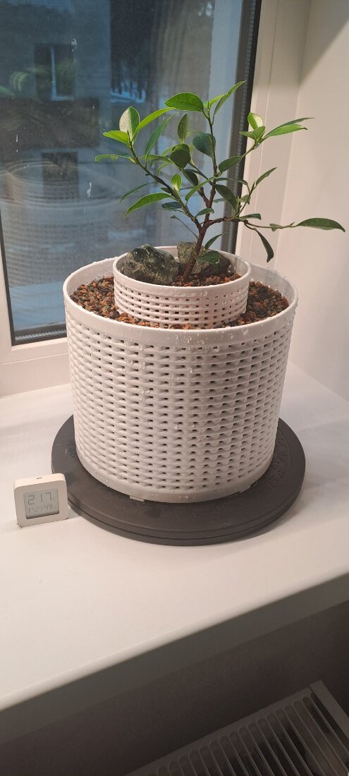 Kamolovlad Опубликовано 5 Марта Автор Поделиться Опубликовано 5 Марта В среду 5 марта я получил ещё одну ёмкость для фикуса, а так же новую порцию готового грунта. Такой же дуршлаг для изготовления сыра, только объёмом больше. Ровно месяц назад был пересажен в AirPot объёмом 1.1 литра, а сейчас произведена перевалка вместе с этой "тарой" в большую. Её объем равен 4.5 литра ровно. Сделано это было осмысленно, для того, чтобы максимально дать молодому развивающемуся растению на летний сезон набрать корневую массу. Больше грунта >>> больше корней Больше корней >>> больше крона Больше крона >>> толще ствол При перевалке родной горшок был поднят выше уровня основного обьема. Фикус находится в активном росте. Наложенная проволока начинает вьедаться в кору. Прогнозируемая обрезка будет произведена примерно через 1 месяц, выборочно. А так же снятие и возможно наложение новой проволоки. При хороших условиях на улице будет выставлен на лоджию. Всем спасибо за внимание) Ссылка на сообщение Поделиться на других сайтах